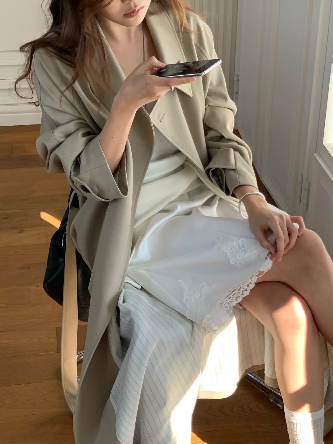 自然に流れるシルエットが際立つロングトレンチコートです。