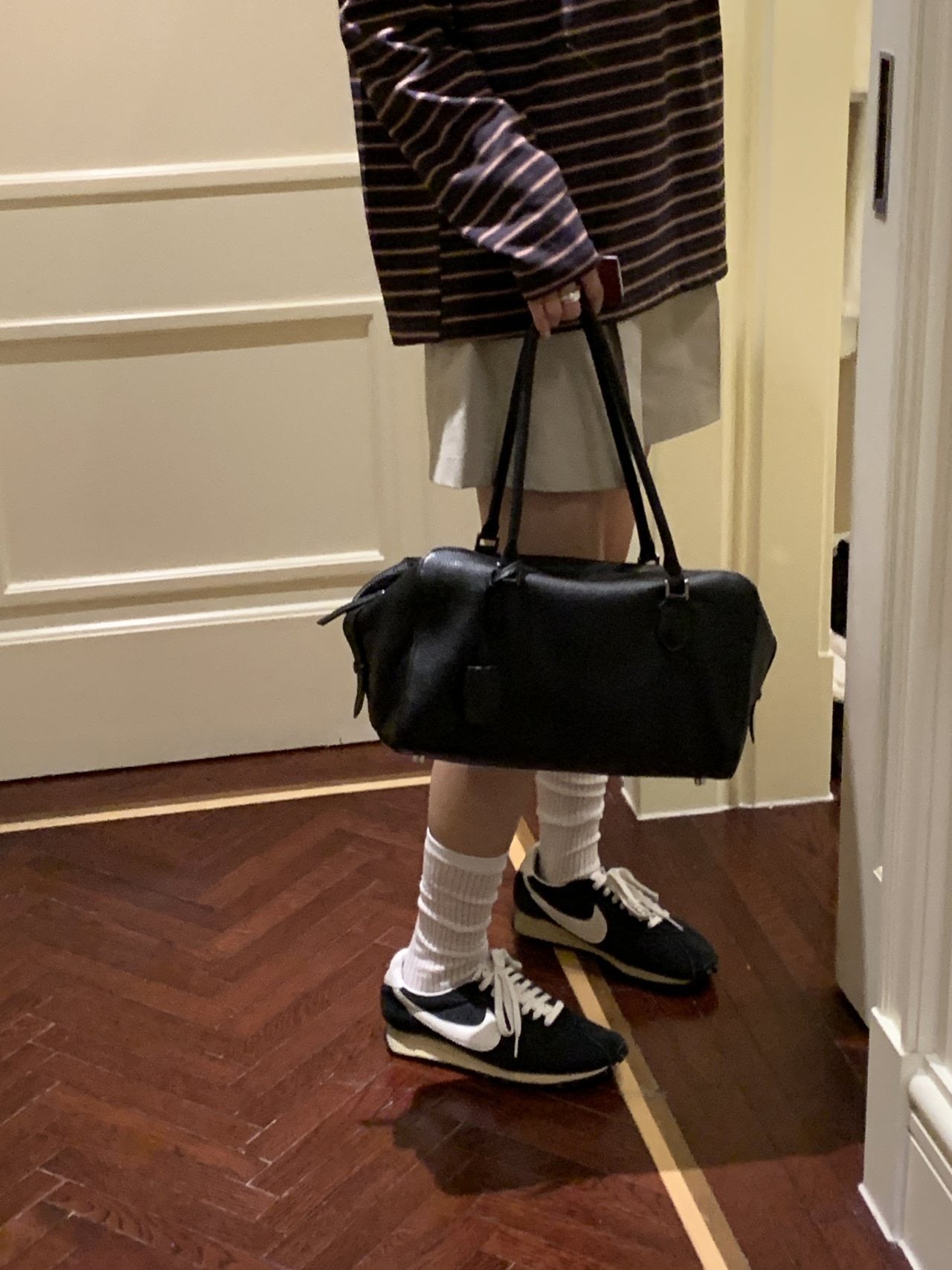 膝上までのハーフ丈がバランスの取れた比率を作り、さまざまなトップスと合わせやすいです。