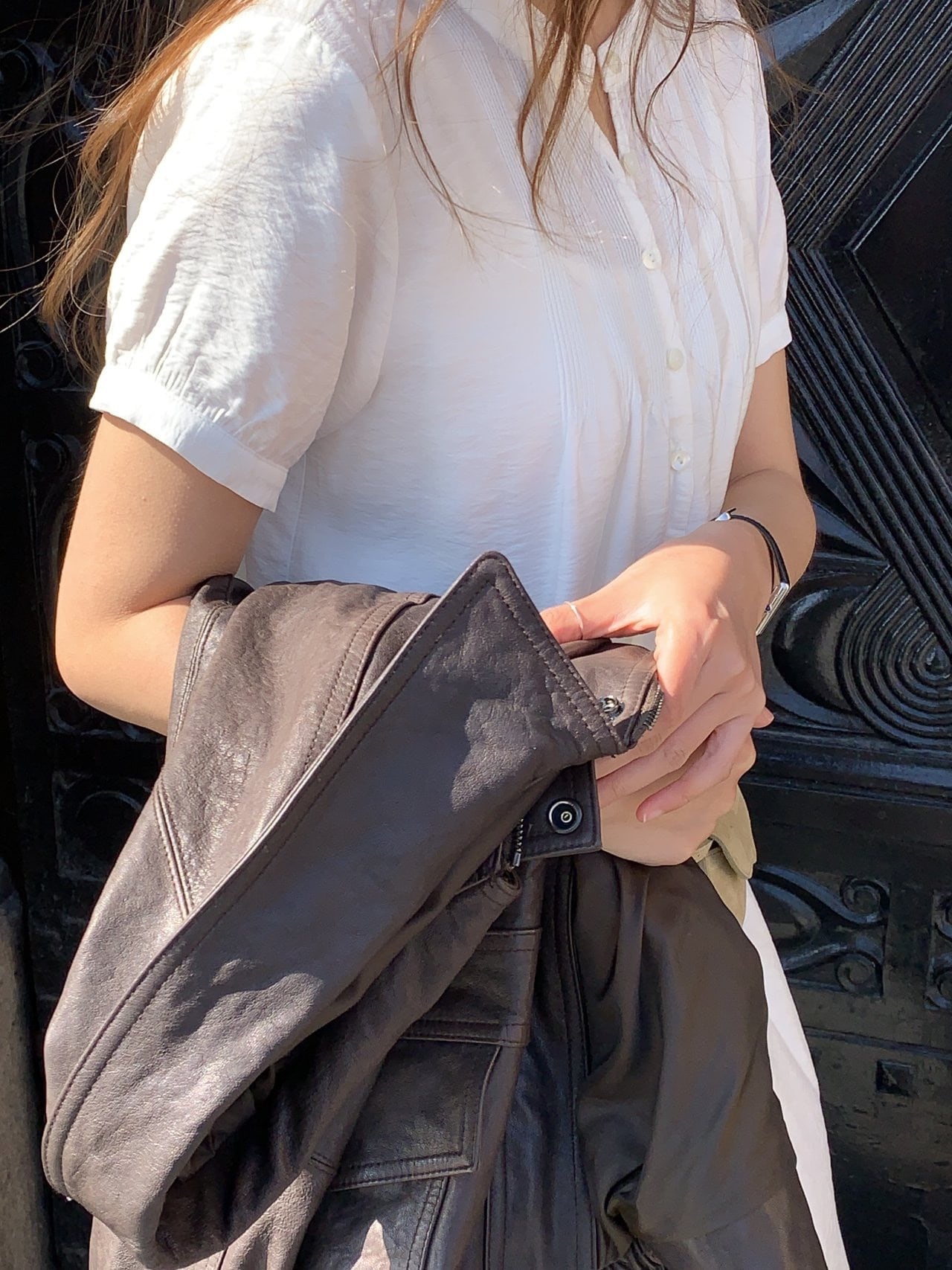 前身頃全体に繊細に施された多数のピンタックとヘンリーネックのボタンディテールが最大のポイントでございます。