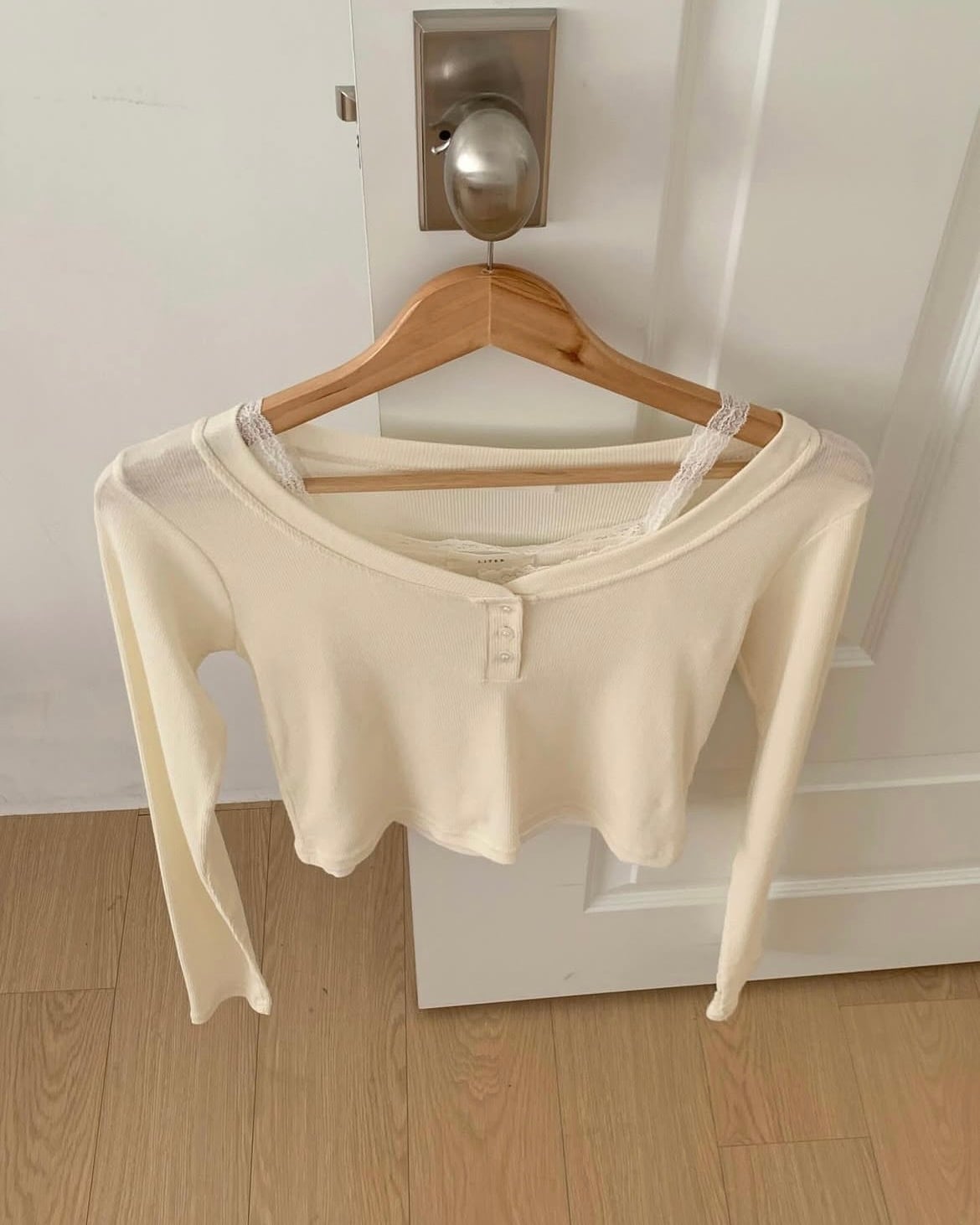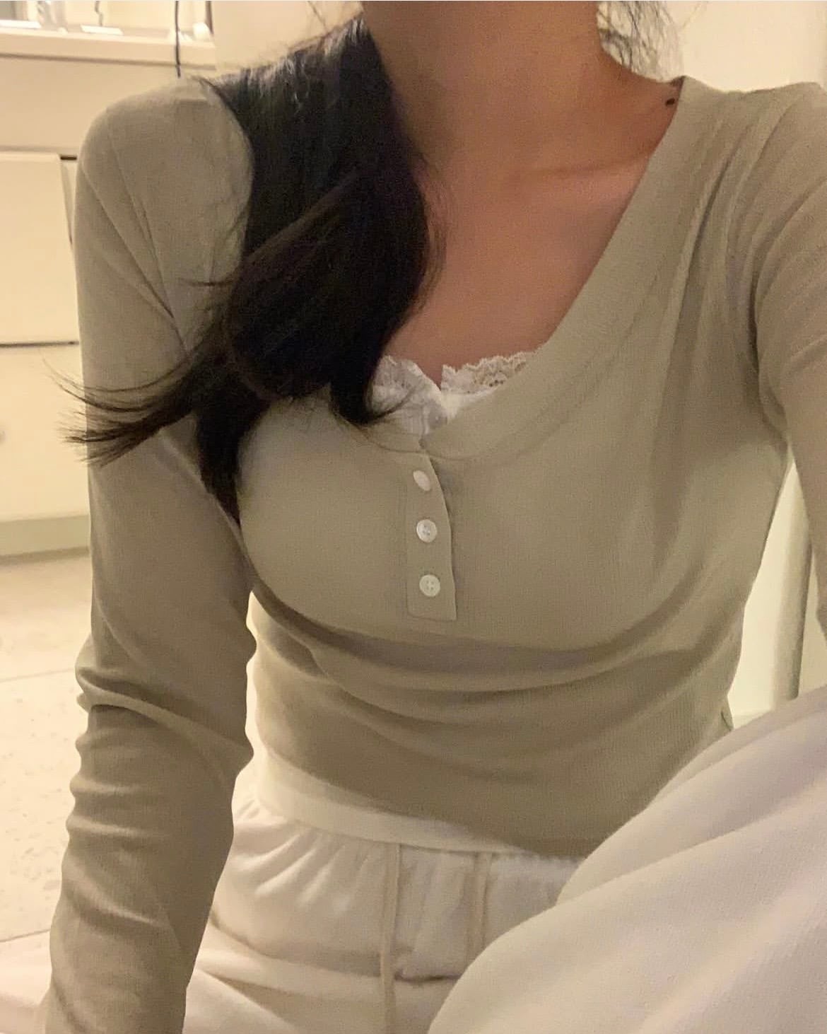 鎖骨と首元がすっきり見えるように広がるラウンドVネックラインに、ミニボタンのディテールでアクセントを加え、手の甲を覆う袖ラインと、スリムなシルエットのさわやかなクロップ丈で、インナーが少し見えるようにレイヤードしたときが最も美しいです。