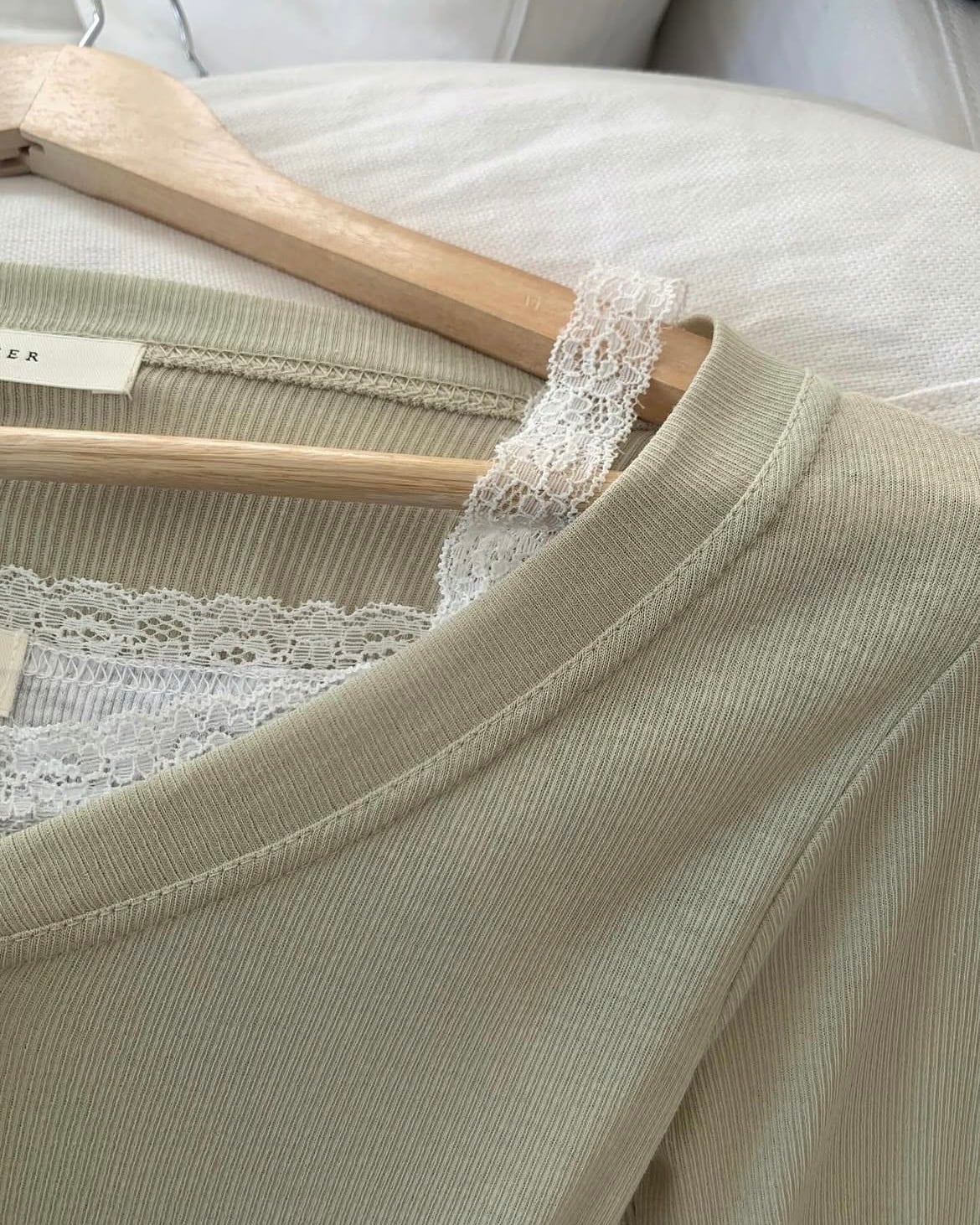 柔らかなテクスチャーの細かいリブ編みとしっかりとした組織感の生地で、季節の変わり目に軽くインナーとレイヤードしやすく、一般的なリブ素材の製品に比べて伸びにくいのが特徴です。