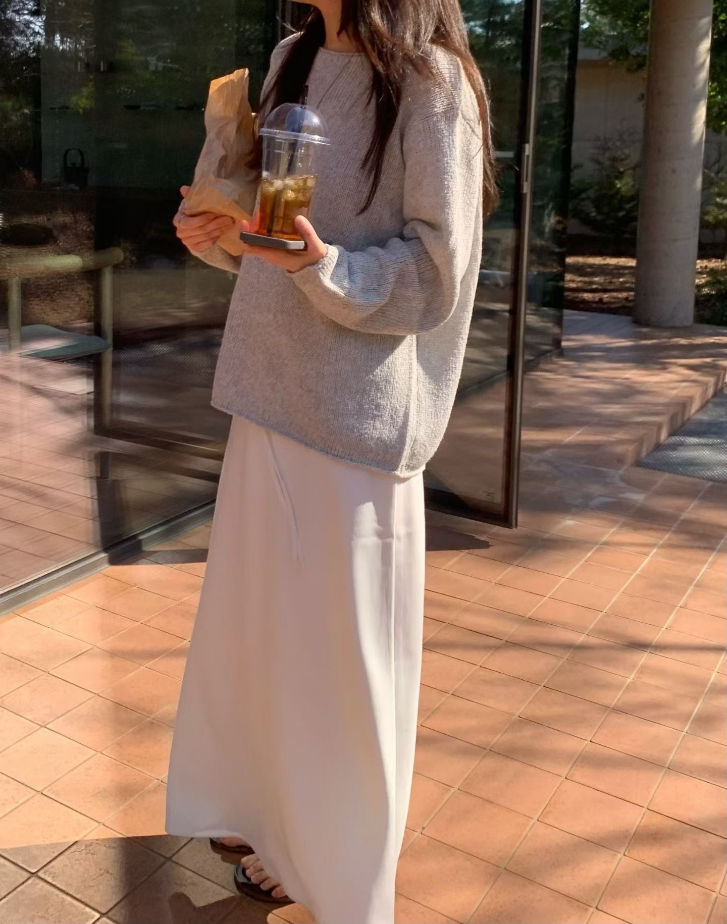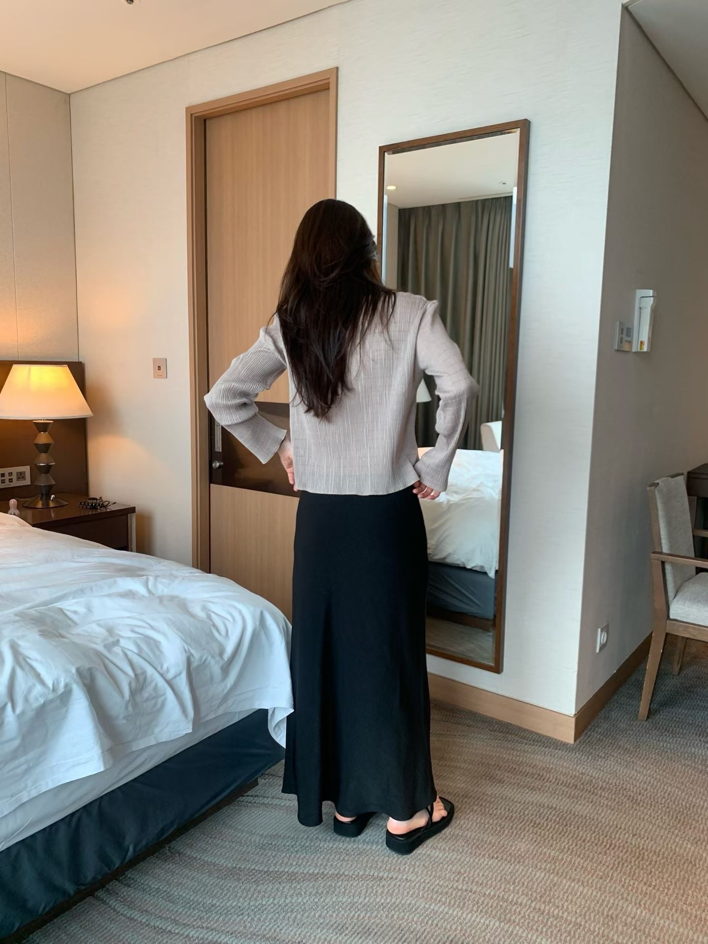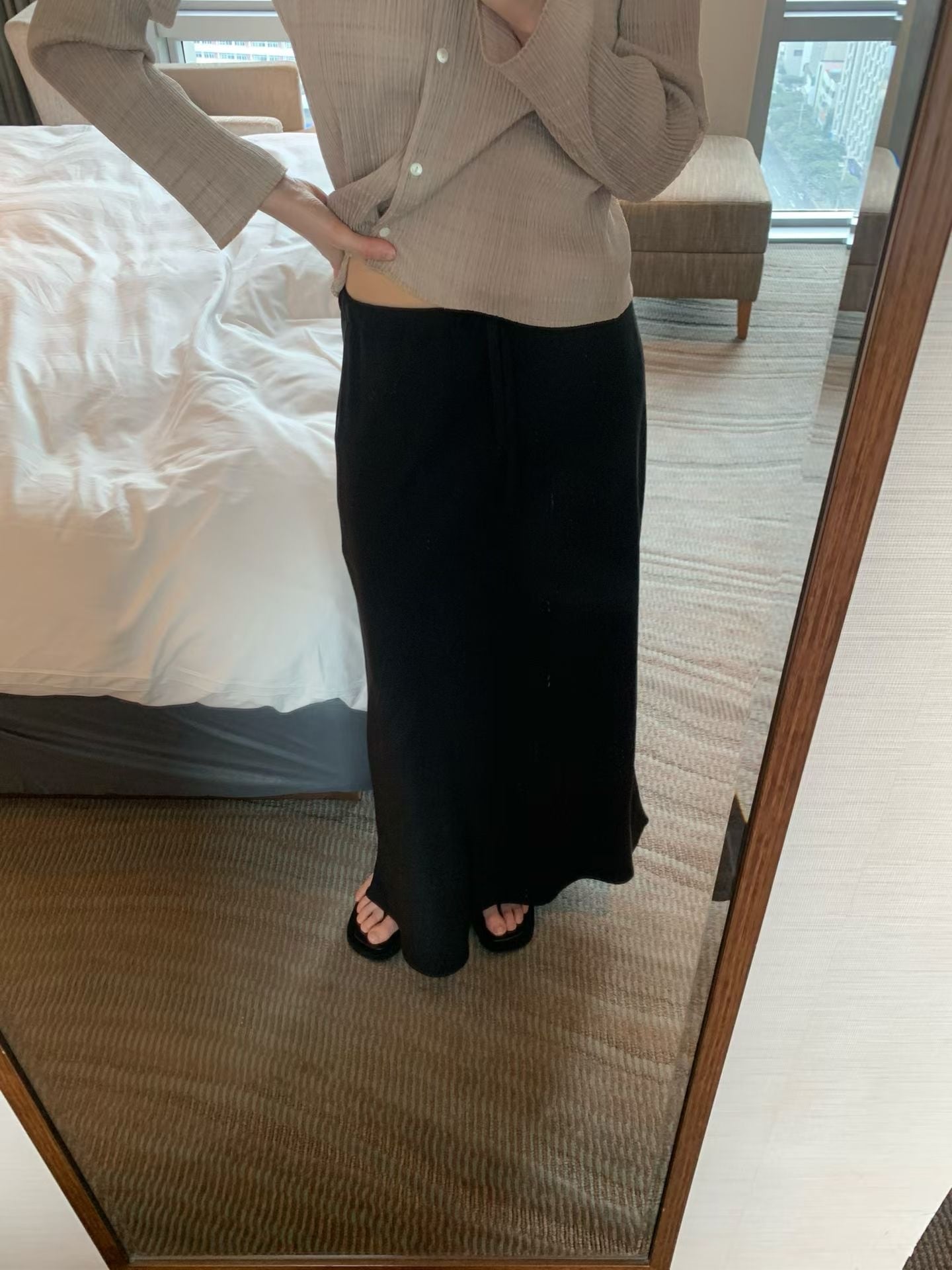 薄くない素材を使用しており、透け感なく着用できるシルキースカートです。