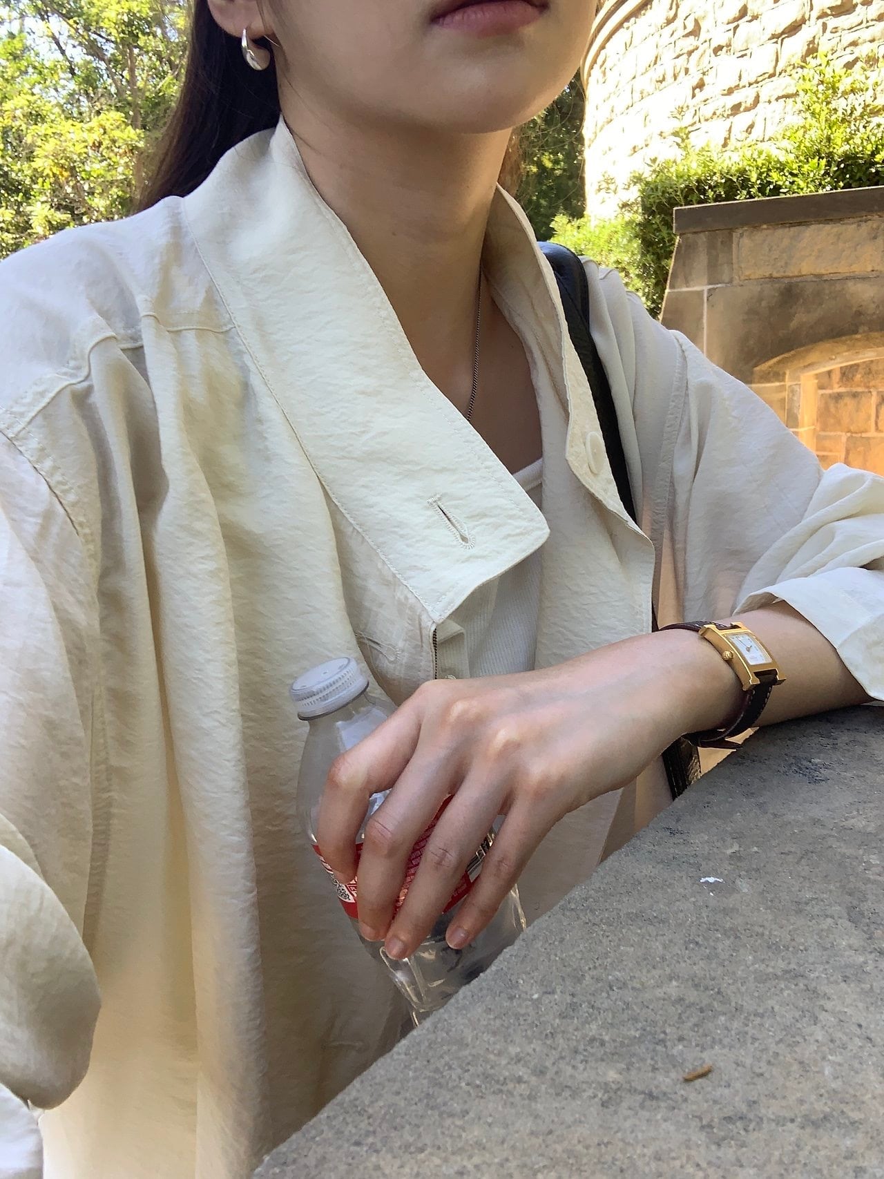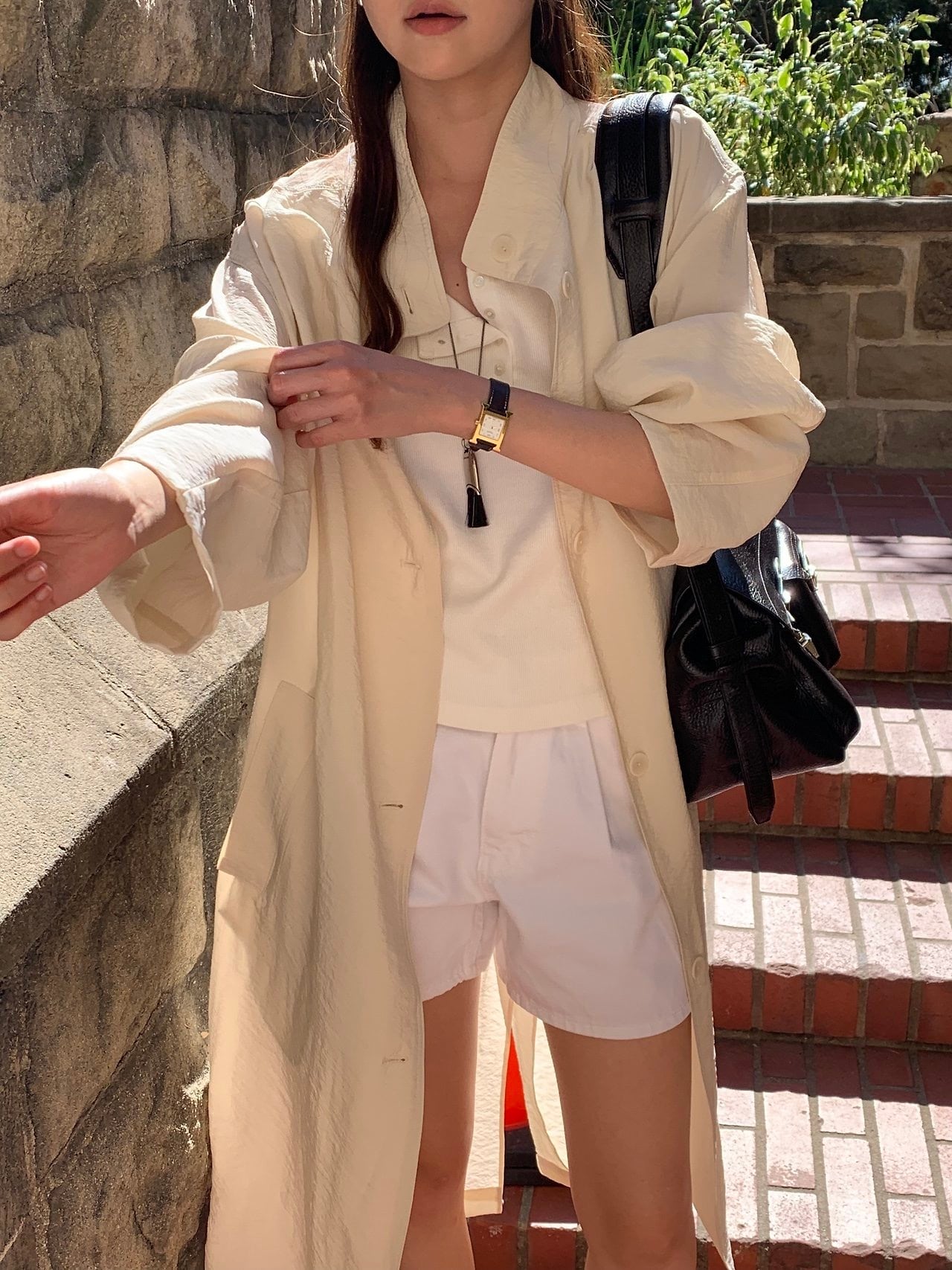 曲線的に上がるスタンドカラーと 抑えたボタンディテールがミニマルなムードを完成させ、