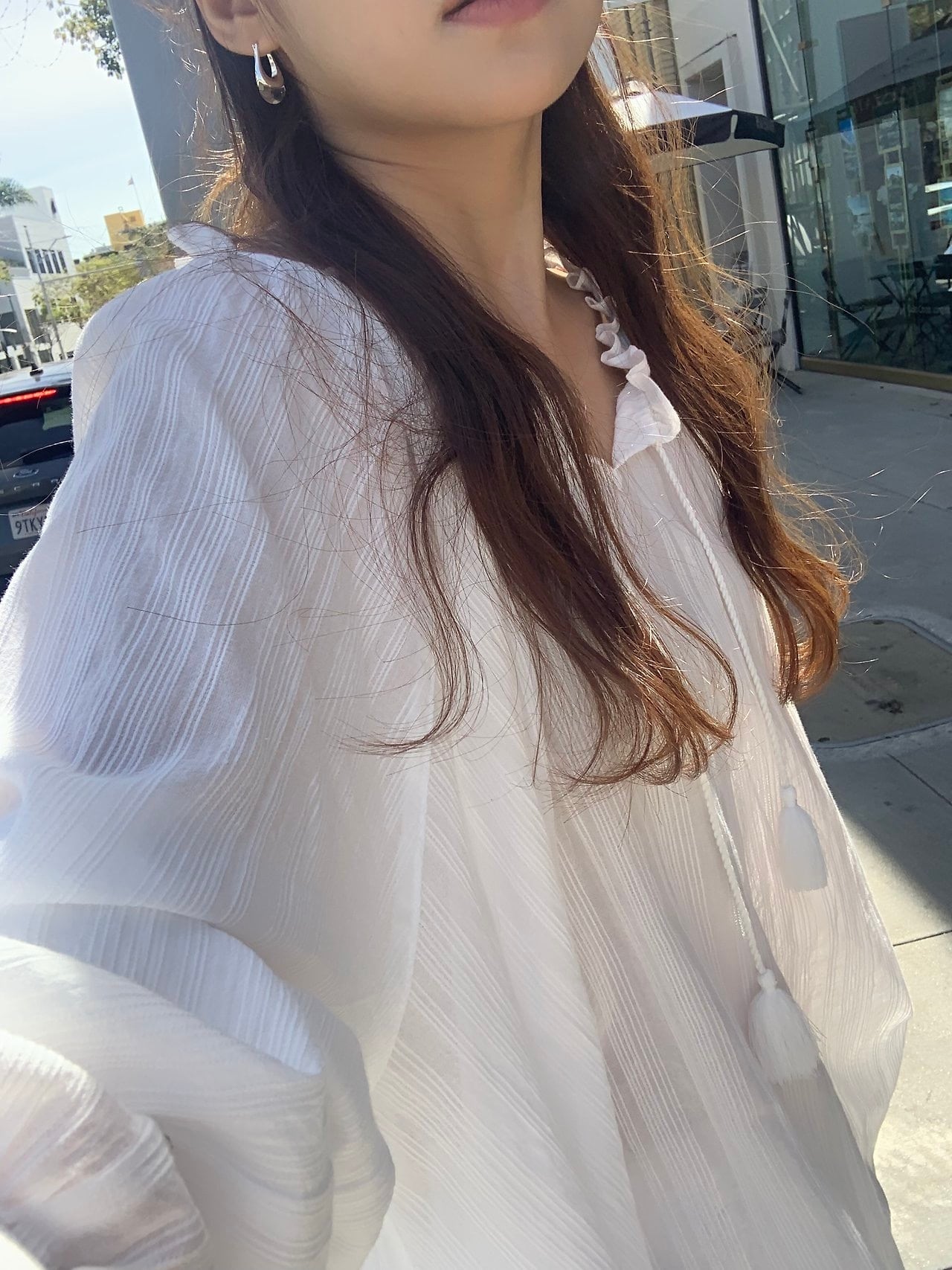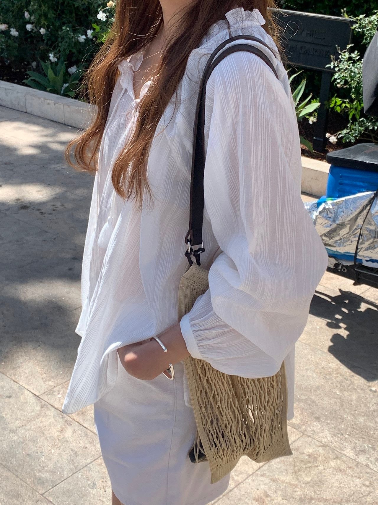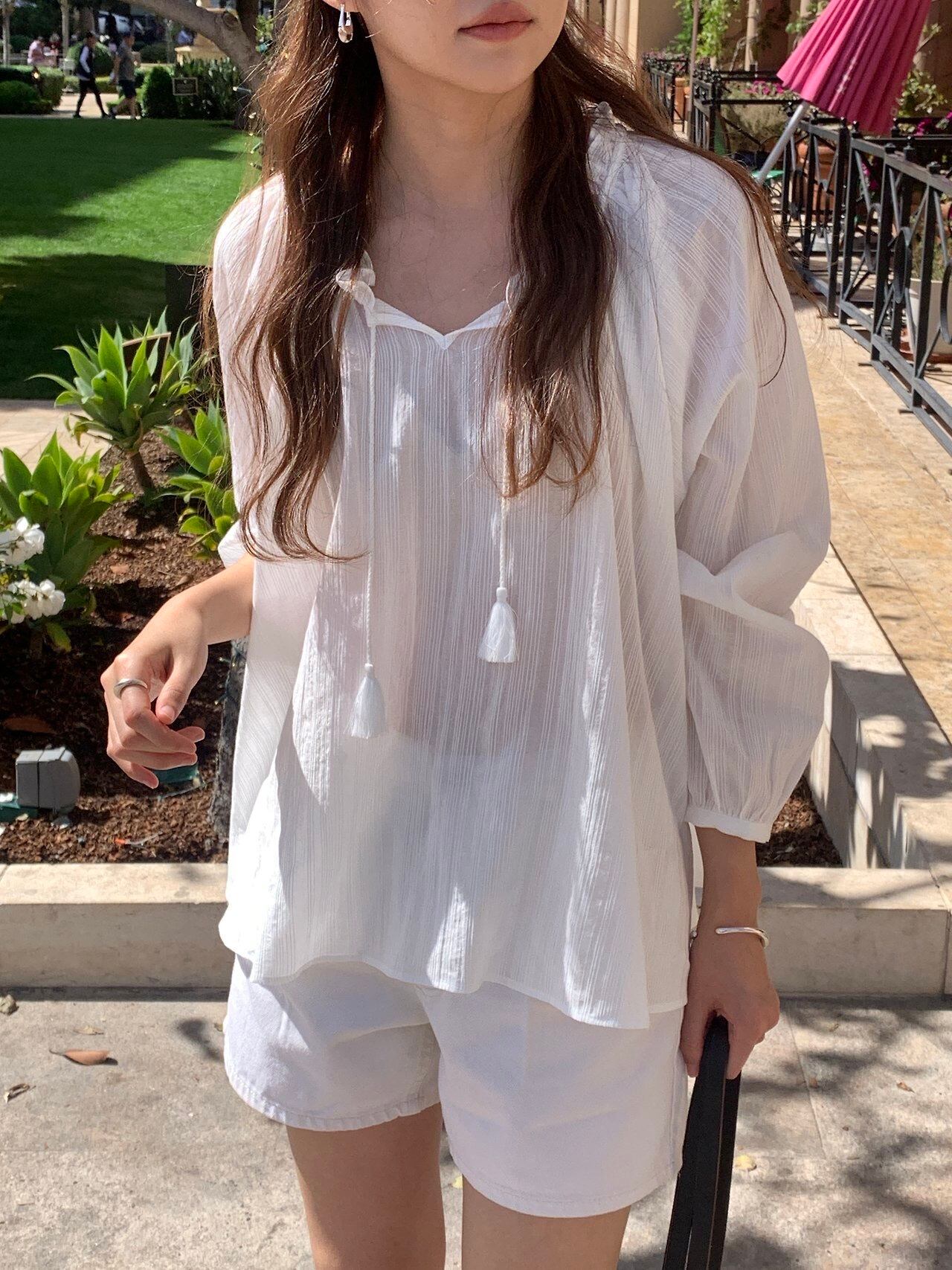 ネックラインに沿って施されたフリルのディテールとタッセルストリングが調和し