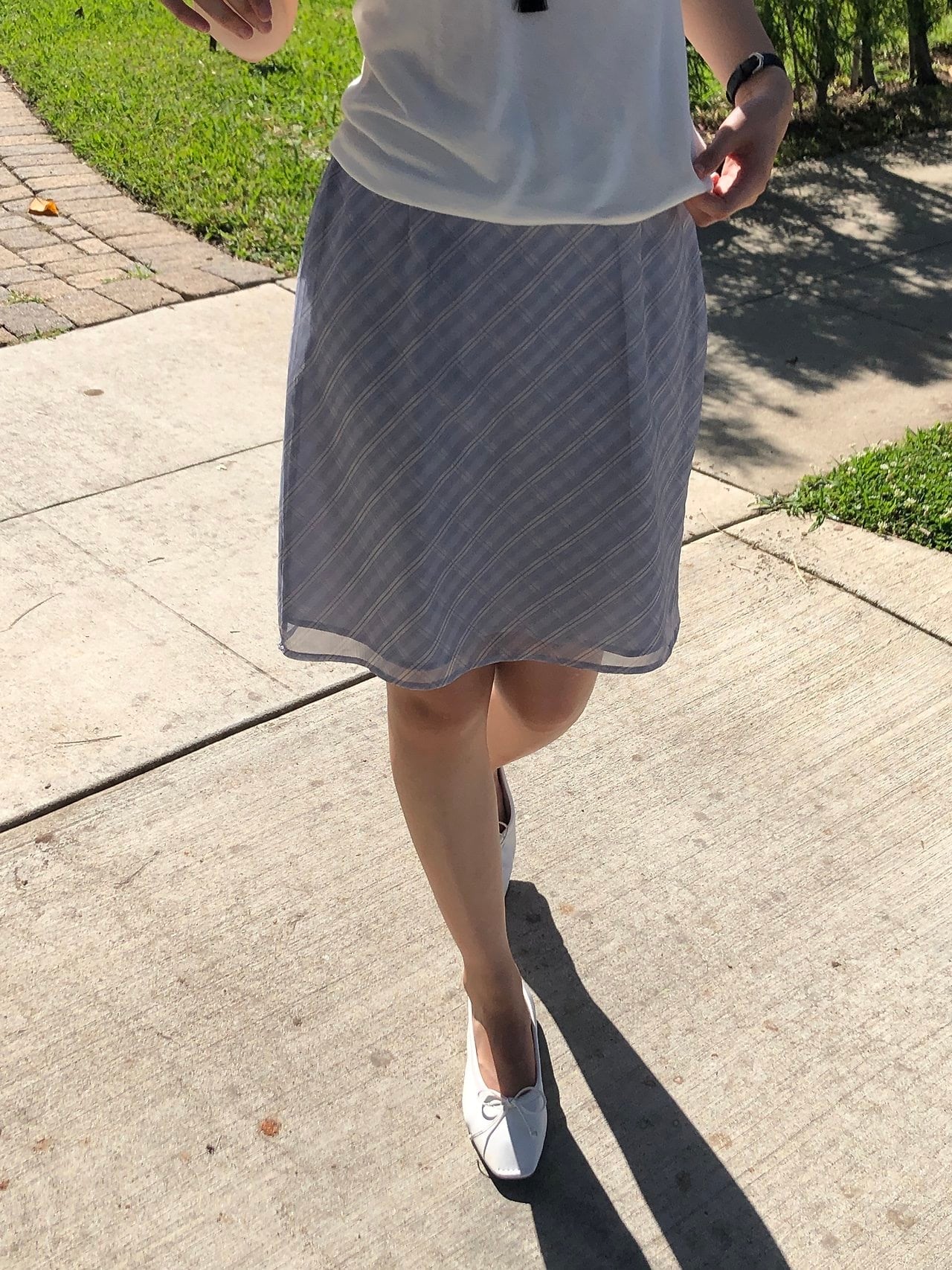薄くて軽いポリエステル素材で作られたチェックミディスカートです。